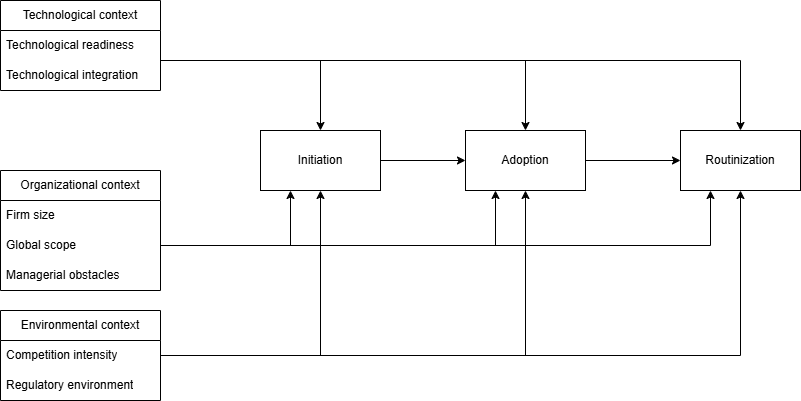 From the research that Zhu and Kraemer conducted, it turned out that for initiation, technological readiness and technological integration were the two most important factors. For adoption, technological integration was the most important, in combination with a non-hostile innovation environment from management. For routinization, technological readiness and integration were the most important.